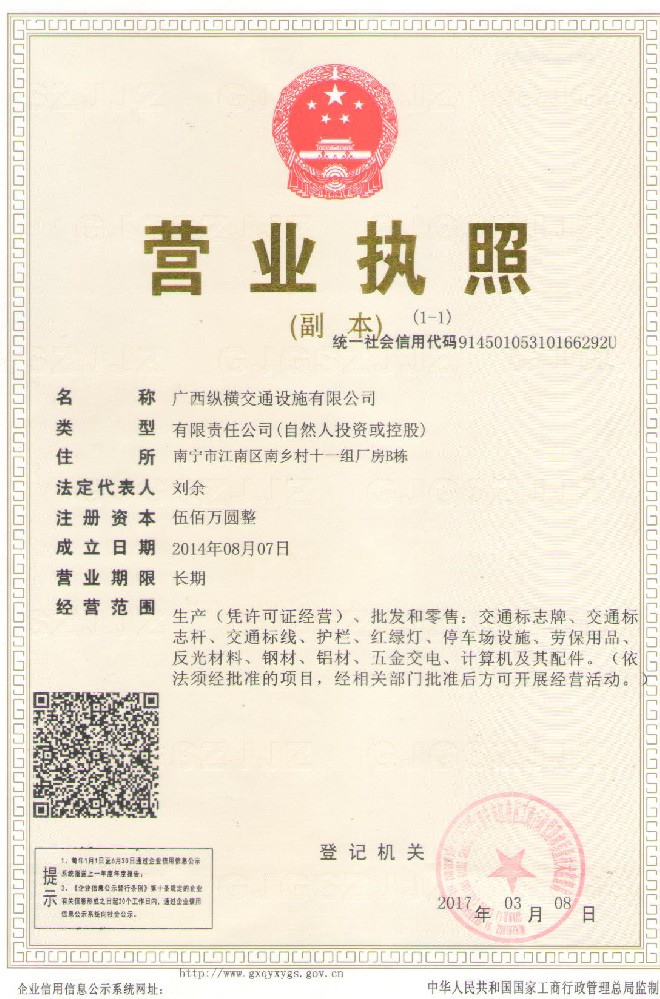 南寧市縱橫交通設(shè)施有限公司   變更為 廣西縱橫交通設(shè)施有限公司。